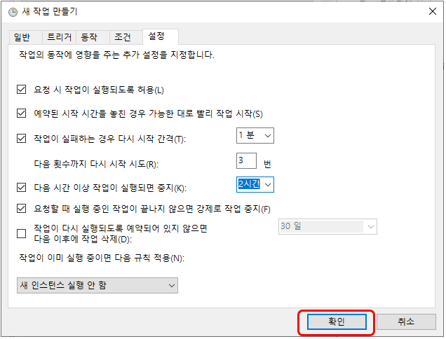 조건 창의 경우 별로 설정해줄 것이 없었다 그대로 진행함
