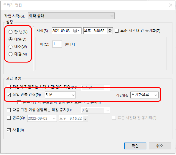 진행 간격 = [설정] : 매일 / [고급 설정] : 5분