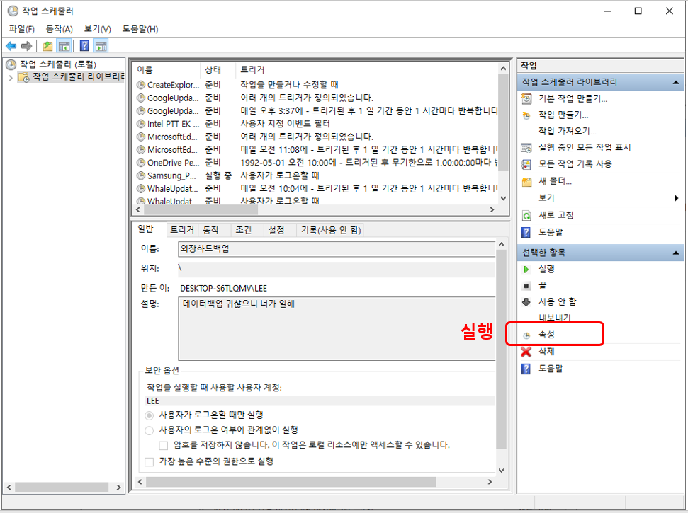 우리가 만들었던 작업을 확인하려면 실행 줄인 작업위치에서 우리가 만든 작업 이름을 찾아보면 된다