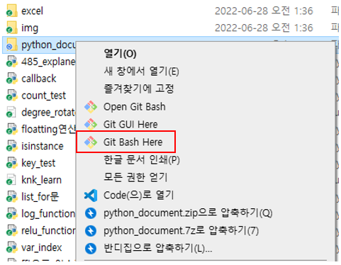 Github에 공유하고 싶은 폴더를 선택 후 마우스 오른쪽 클릭하여 Git Bash Here을 클릭한다.